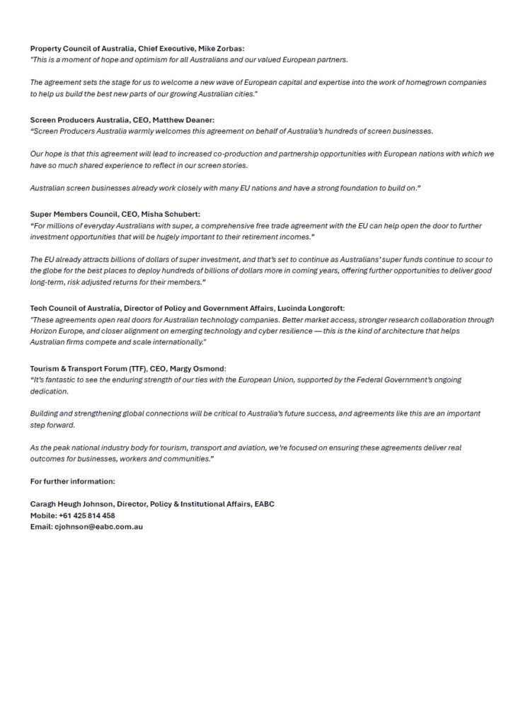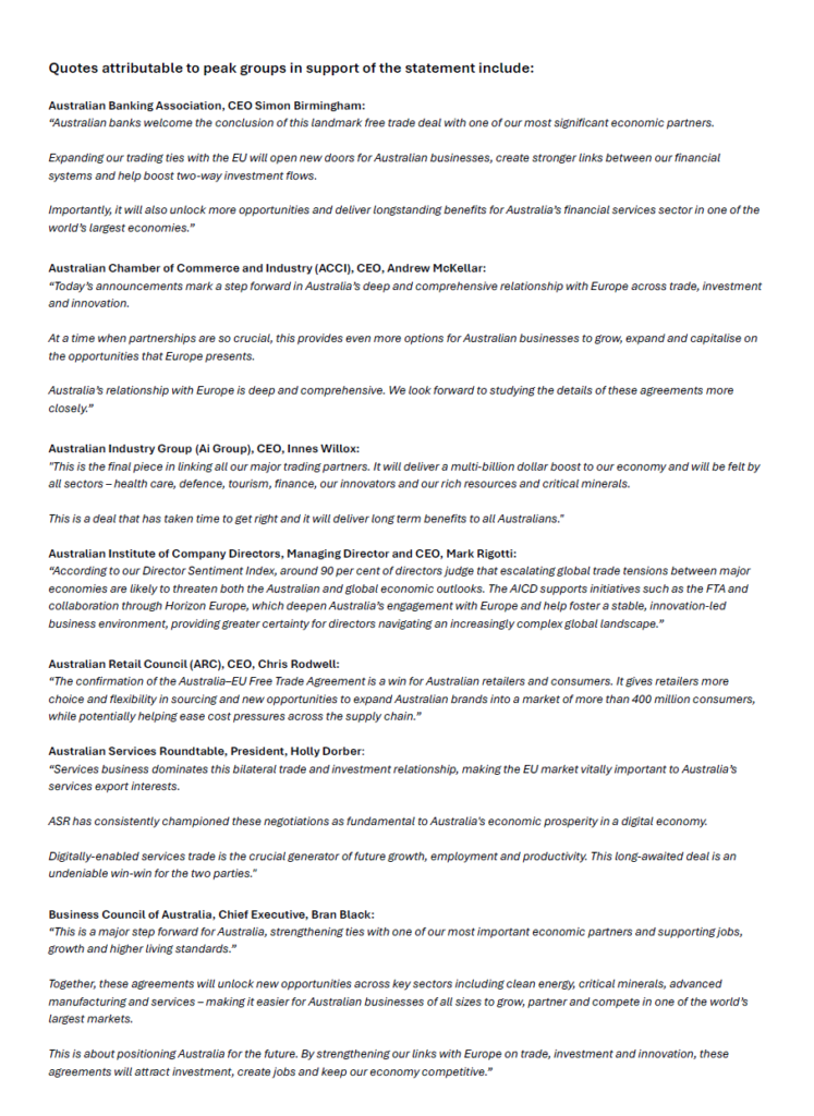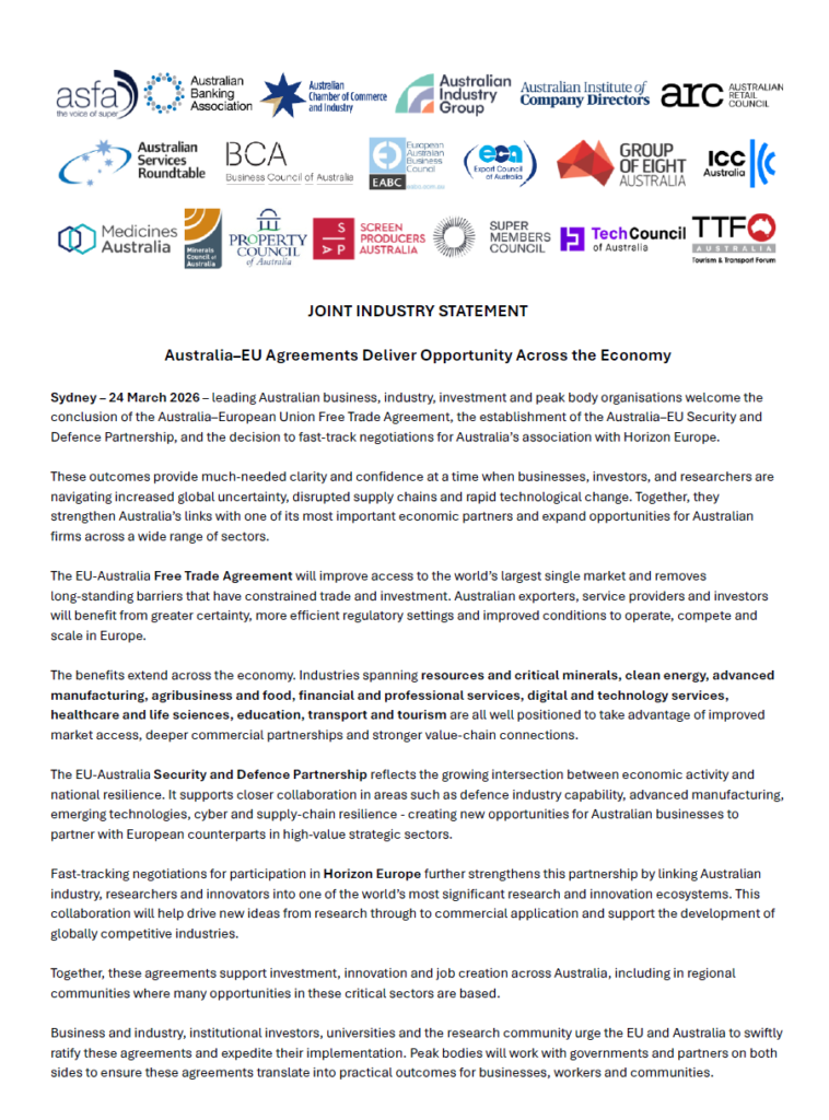 Joint Industry Statement Australia-EU Agreements Deliver Opportunity Across the Economy